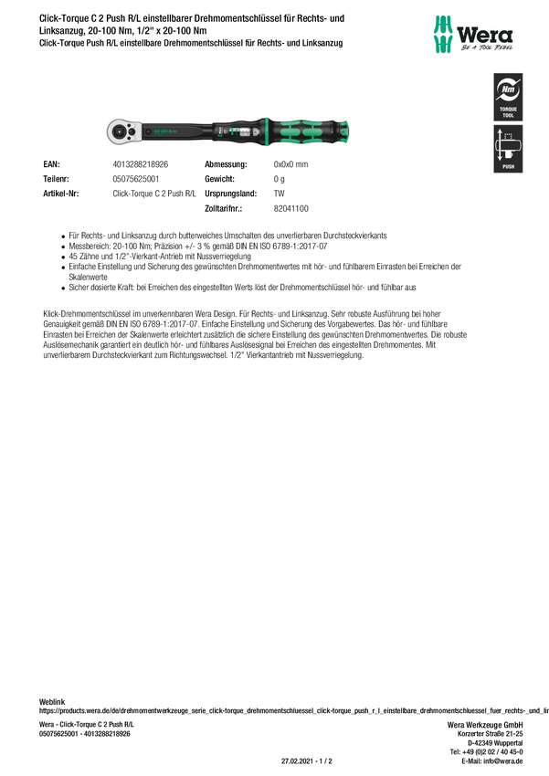 Wera Click-Torque C 2 R/L 05075625001-DAkkS Klucz dynamometryczny Kalibracja (DAkkS) 1/2" (12.5 mm) 20 - 100 Nm