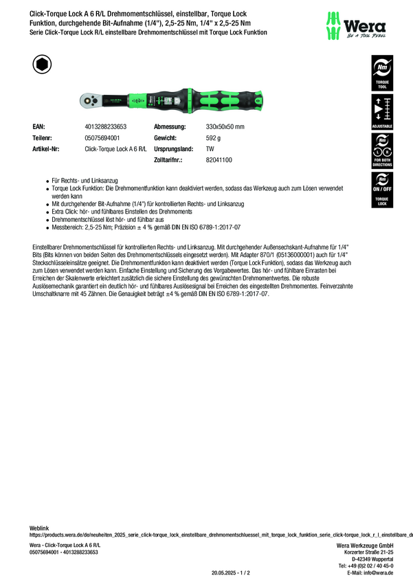 Wera Click-Torque Lock A 6 R/L 05075694001 Klucz dynamometryczny 1/4" (6.3 mm) 2.5 - 25 Nm