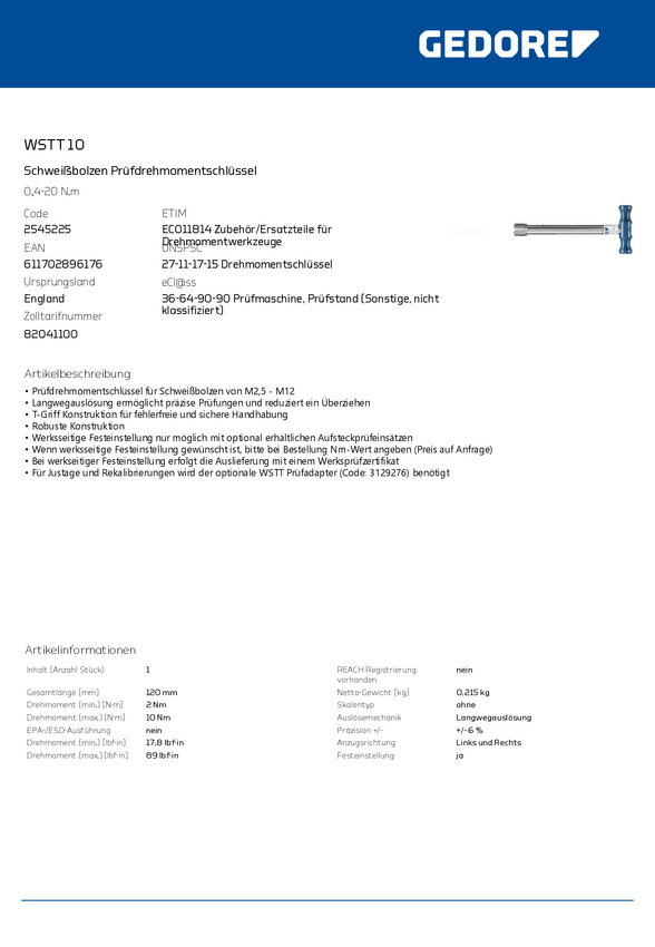 Gedore 2545225 Klucz dynamometryczny do testów kołków spawalniczych 0,4-20 Nm