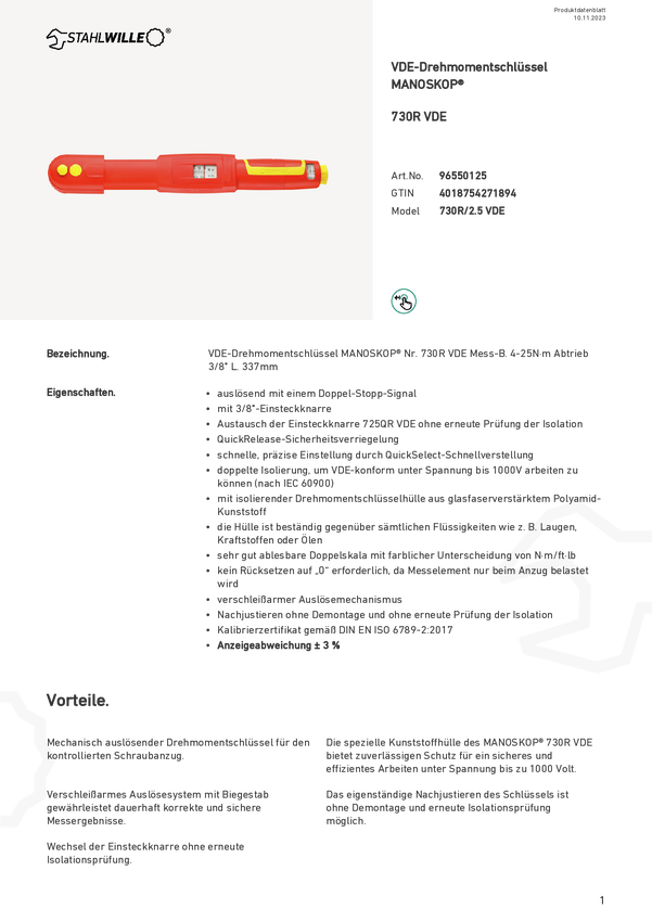 Klucz dynamometryczny Stahlwille 730R/2.5 VDE 96550125, 4 - 25 Nm