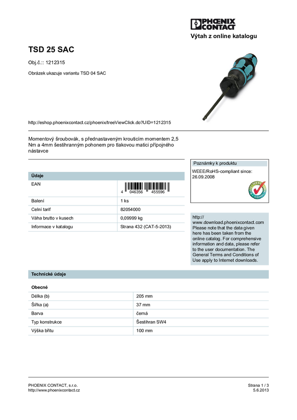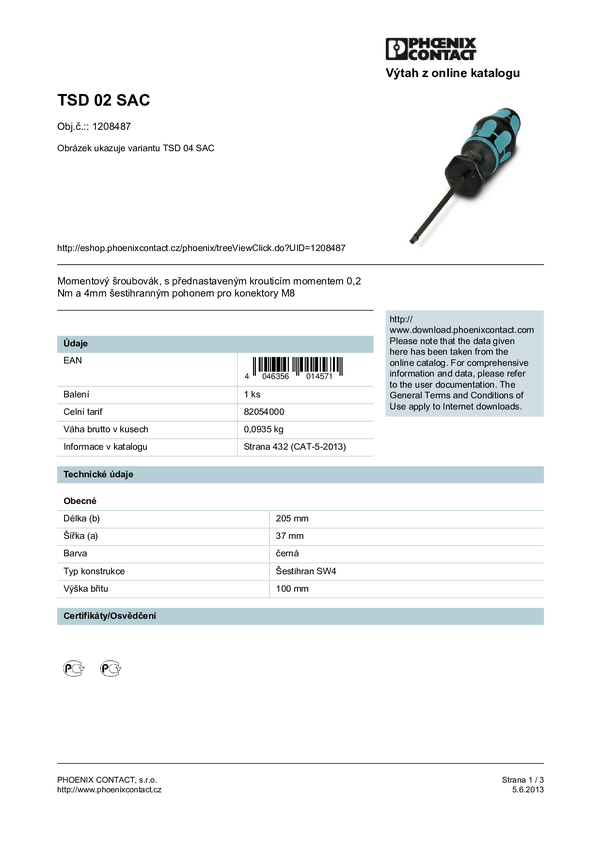 Wkrętak dynamometryczny Phoenix Contact TSD 02 SAC 1208487 0.2 - 2.5 Nm