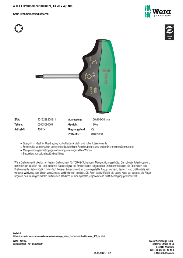 Wkrętak dynamometryczny Wera fest eingestellt 5005090001