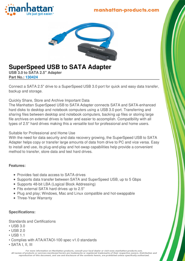 Manhattan dyski twarde/SSD adapter [1x złącze męskie USB-A 3.2 (USB 3.0) - 1x złącze męskie SATA 15+7-pin] Adapter 0.15