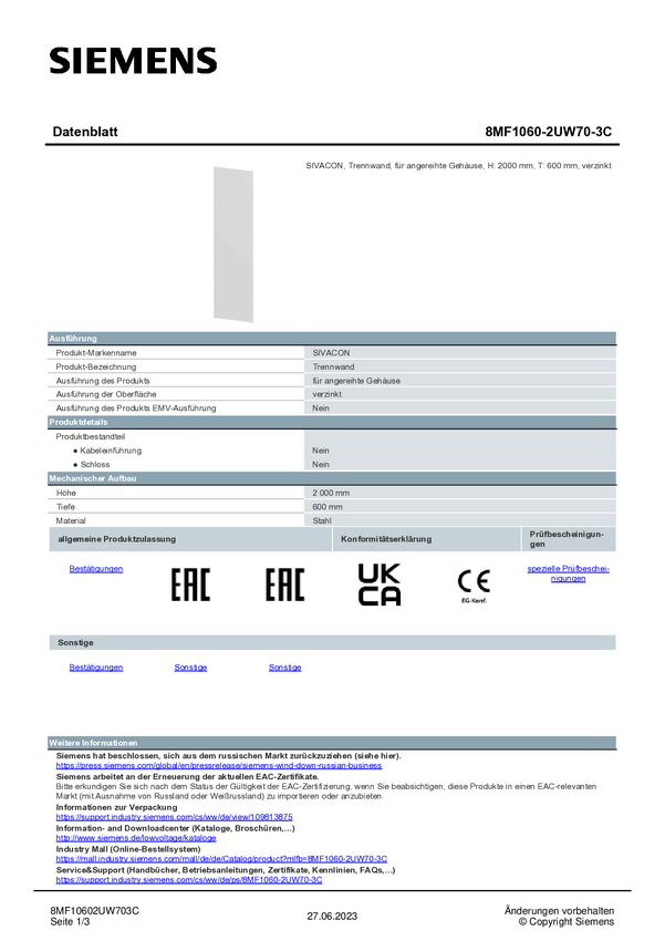 Ścianka działowa Siemens 8MF1060-2UW70-3C 1 szt.