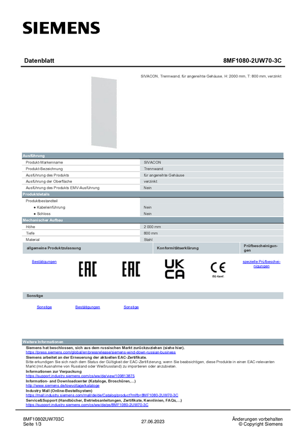 Ścianka działowa Siemens 8MF1080-2UW70-3C 1 szt.