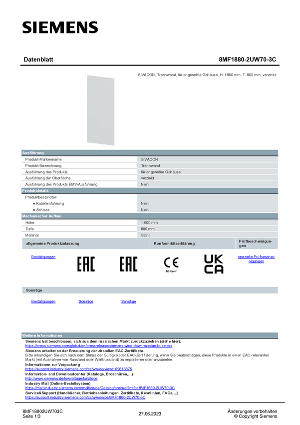 Ścianka działowa Siemens 8MF1880-2UW70-3C 1 szt.