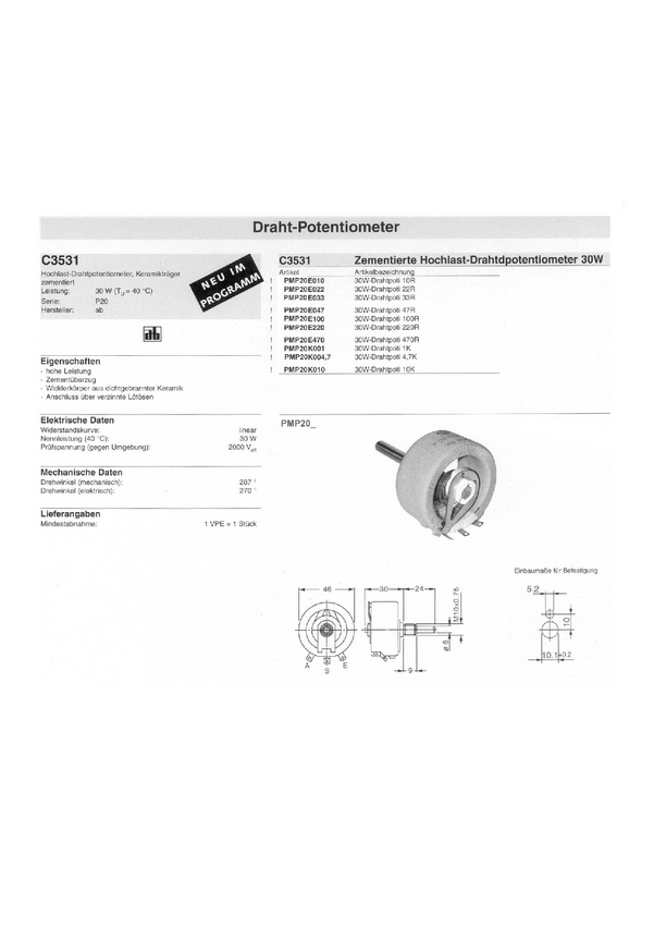 Potencjometr drutowy; 30W średnica 46mm; dł.30mm, dł.ośki 24mm, śr.ośki 6mm (drut nawinięty na karkasie ceramicznym, niezabudowany)
