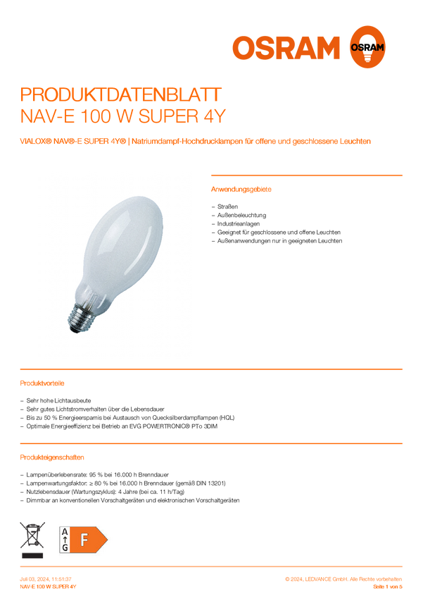 OSRAM HOMELIGHTING lampa wyładowcza NAV-E100WSUPER4YE4012X1 183.0 mm E40 100 W EEK: F (A - G) Kształt reflektora regulac