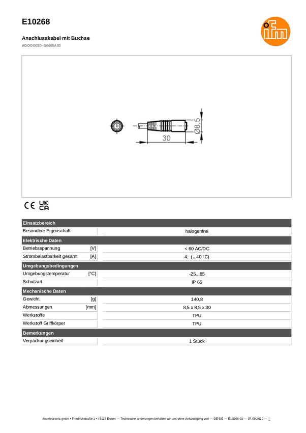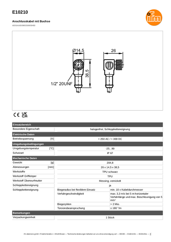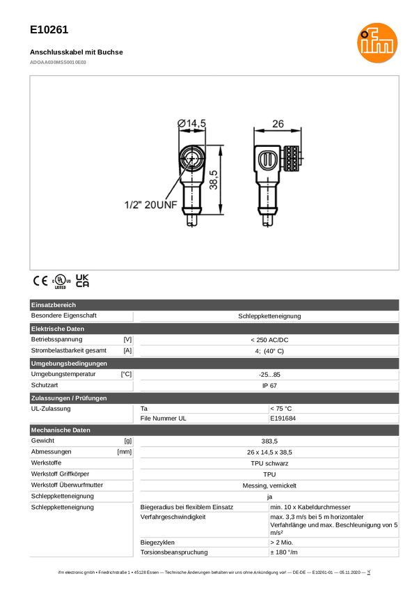 ifm Electronic E10261 Kabel połączeniowy E10261, piny: 3, 10 m, 1 szt.
