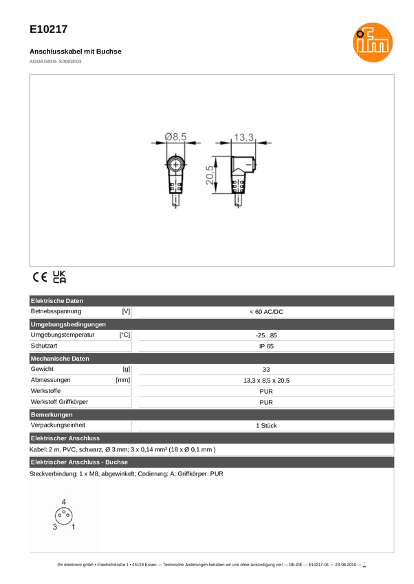 ifm Electronic E10217 Kabel połączeniowy E10217, piny: 3, 2 m, 1 szt.