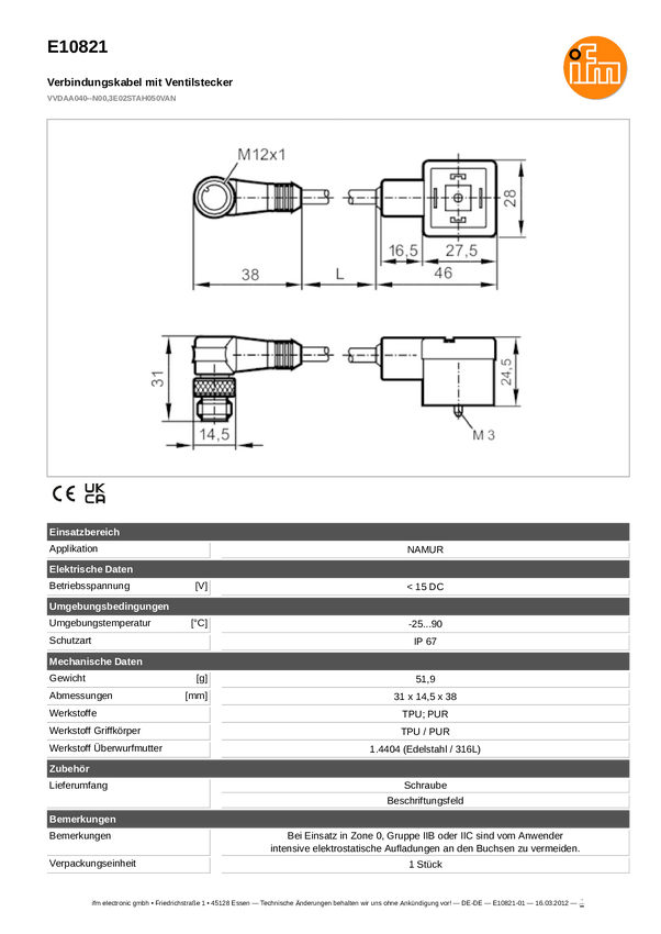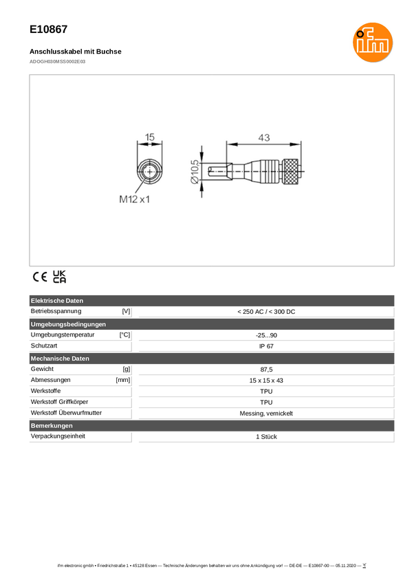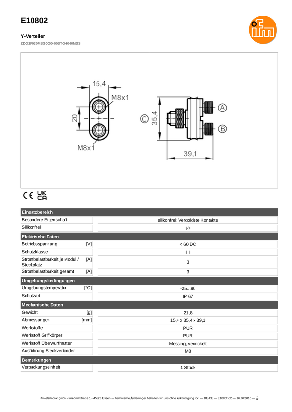 ifm Electronic E10802 Linia dystrybucyjna E10802, piny: 4, 3, 1 szt.