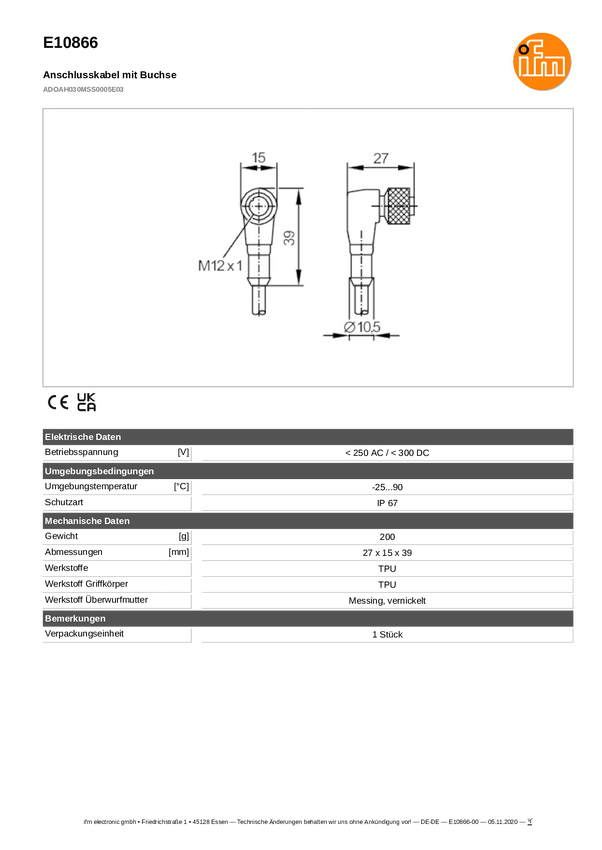 ifm Electronic E10865 Kabel połączeniowy E10865, piny: 3, 2 m, 1 szt.