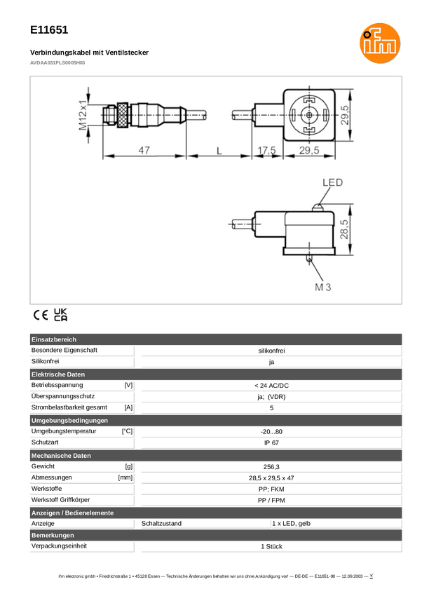 ifm Electronic E11651 Złącze męskie zaworowe z kablem formowanym E11651, A standard, styki: 4, 24 V DC/AC, 1 szt.