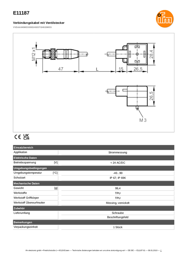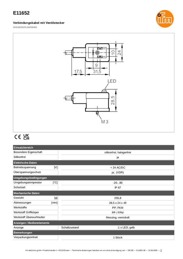 ifm Electronic E11428 Złącze męskie zaworowe z kablem formowanym E11428, C standard, styki: 3, 4, 24 V DC/AC, 1 szt.