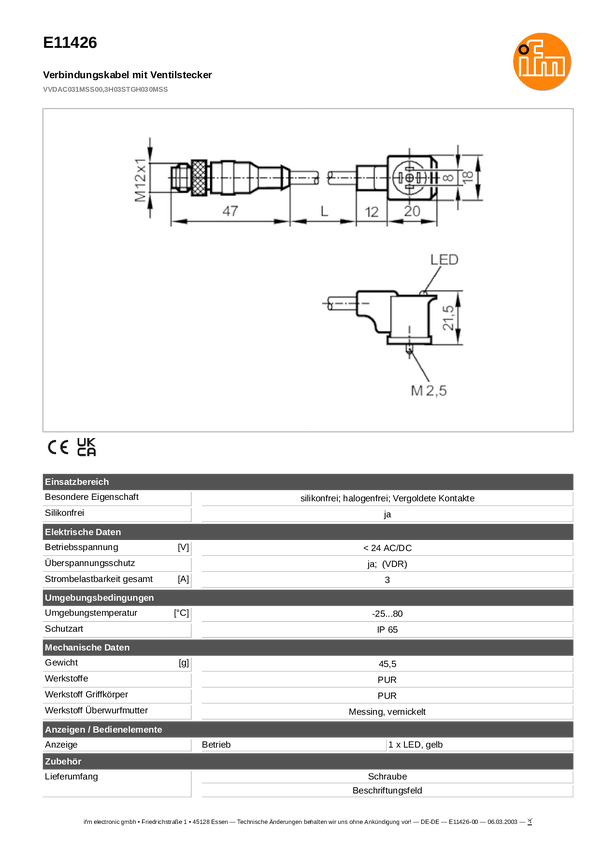 ifm Electronic E11426 Złącze męskie zaworowe z kablem formowanym E11426, C standard, styki: 3, 4, 24 V DC/AC, 1 szt.