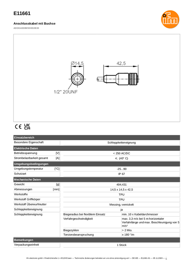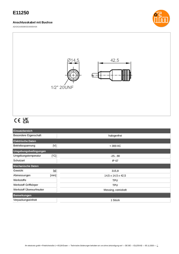 ifm Electronic E11250 Kabel połączeniowy E11250, piny: 5, 5 m, 1 szt.