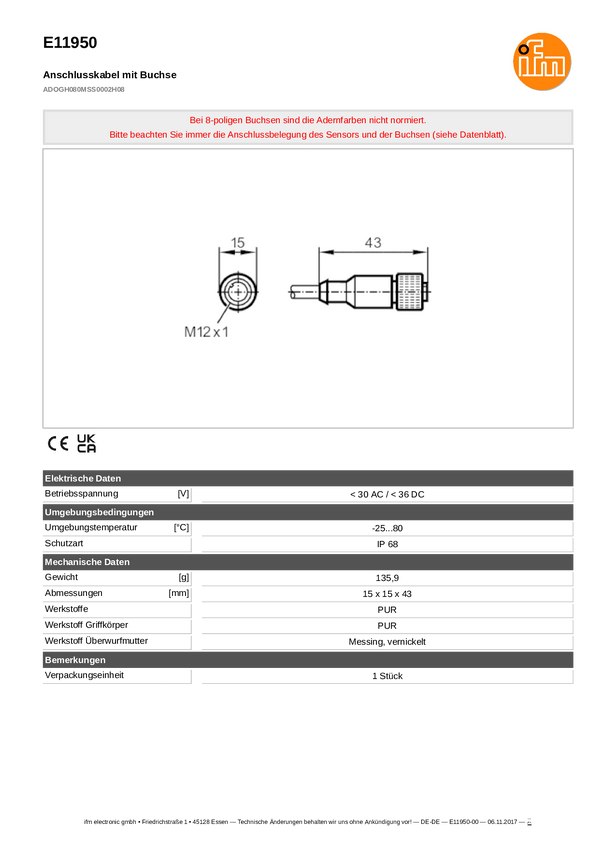 ifm Electronic E11950 Kabel połączeniowy E11950, piny: 8, 2 m, 1 szt.