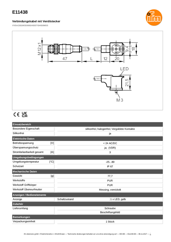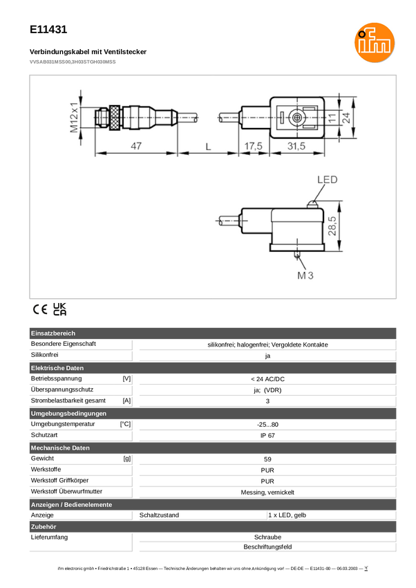 ifm Electronic E11431 Złącze męskie zaworowe z kablem formowanym E11431, B standard, styki: 3, 3, 24 V DC/AC, 1 szt.