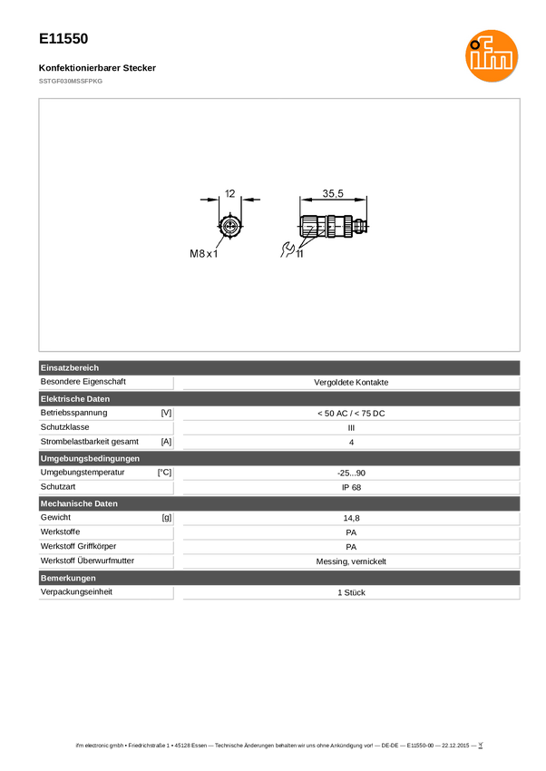ifm Electronic E11550 Złącze niekonfekcjonowane czujnika/aktuatora złącze męskie proste Ilość pinów: 3 1 szt.