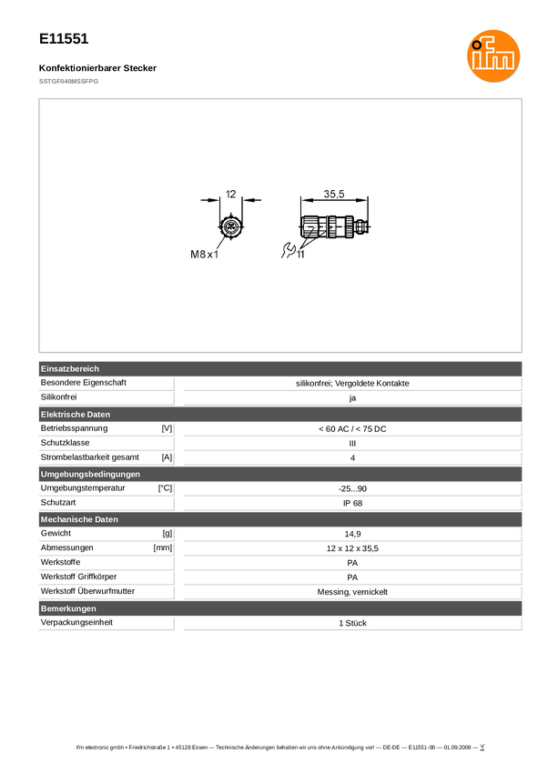 ifm Electronic E11551 Złącze niekonfekcjonowane czujnika/aktuatora złącze męskie proste Ilość pinów: 4 1 szt.