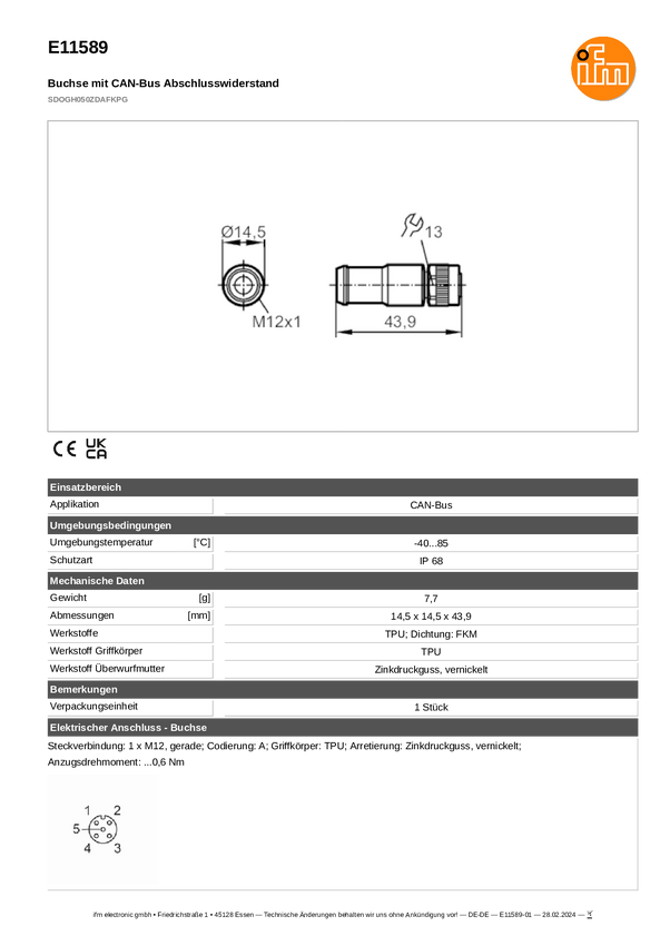 ifm Electronic E11589 Gniazdo rezystora terminującego E11589, piny: 5, 1 szt.