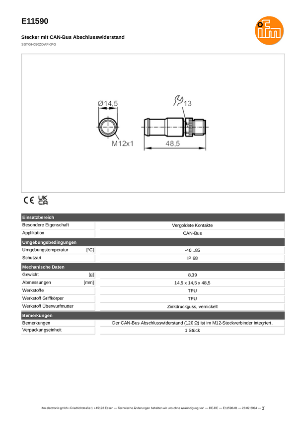 ifm Electronic E11590 Rezystor terminujący Wtyczka złącze męskie proste Ilość pinów: 5 1 szt.
