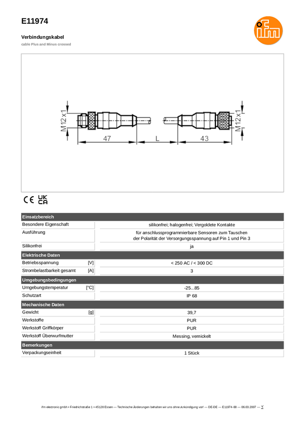 ifm Electronic E11974 Linia połączenia E11974, piny: 4, 4, 0.3 m, 1 szt.