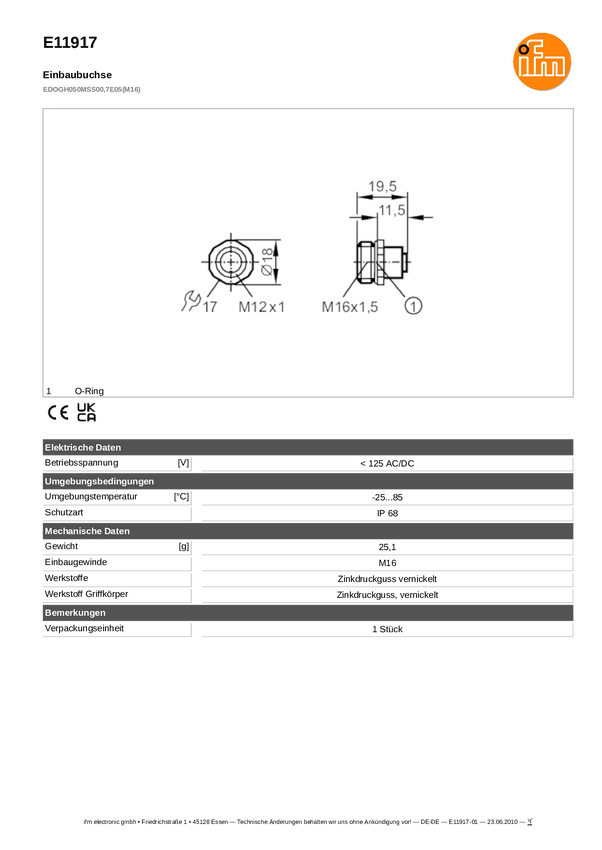 ifm Electronic E11917 Gniazdo montażowe czujnika/aktuatora E11917, piny: 5, 0.7 m, 1 szt.