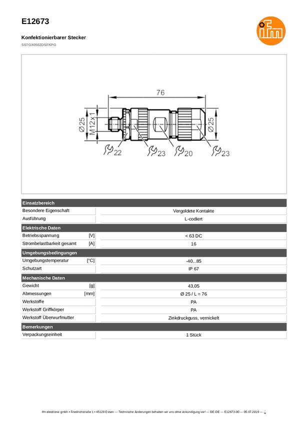 ifm Electronic E12673 Złącze niekonfekcjonowane czujnika/aktuatora złącze męskie proste Ilość pinów: 5 1 szt.
