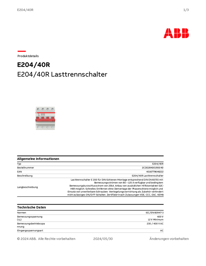 ABB 2CDE284001R0040 E204/40R Przełącznik rozłączający 4 styki