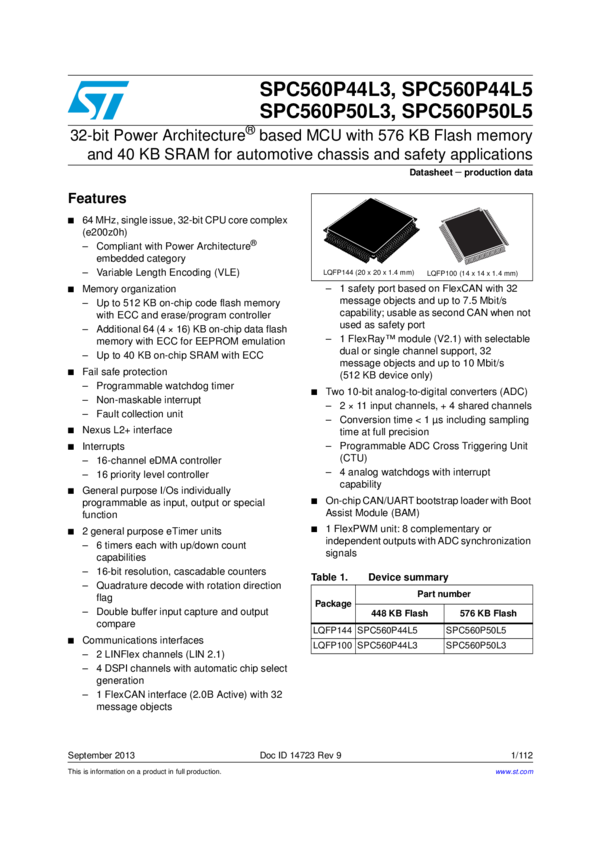 MCU 32-Bit SPC560P50x e200z0 CISC 512KB Flash 5V 100-Pin LQFP Tray