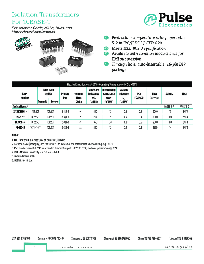Telecom Transformer 1:2.5/1:1 2000Vrms 0.4Ohm Prim. DCR Surface Mount