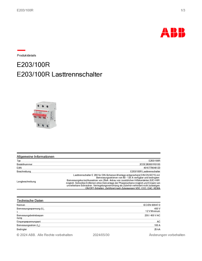 Przełącznik rozłączający ABB E203/100R 2CDE283001R0100, 3 styki