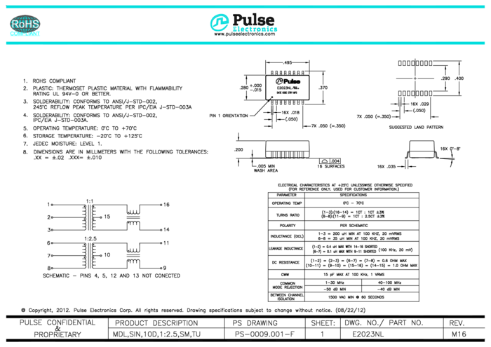 Telecom Transformer 1:1/1:2.5 1500Vac 0.6Ohm Prim. 1Ohm Sec. Surface Mount