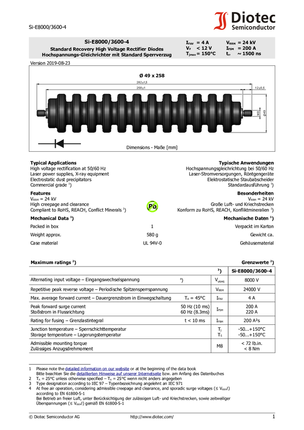 Dioda prostownicza wysokonapięciowa półprzewodnikowa Diotec SI-E8000-4 N/A N/A