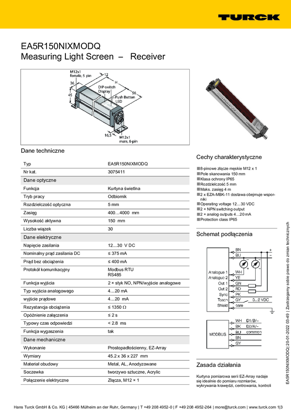 Turck Kurtyna świetlna EA5R150NIXMODQ Wysokość ochronna 150 mm