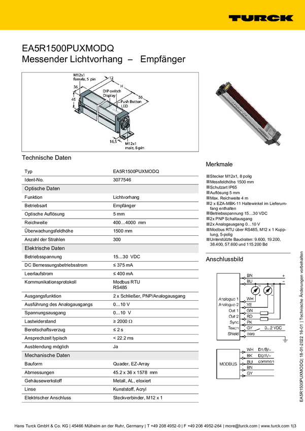 Turck Kurtyna świetlna EA5R1500NUXMODQ Wysokość ochronna 1500 mm