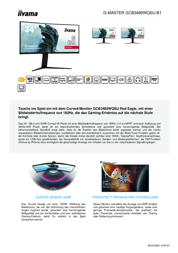 Iiyama G-Master Red Eagle GCB3480WQSU-B1 Monitor EEK E (A - G) 80 cm (31.5 cal) 3440 x 1440 px 21:9 0.4 ms DisplayPort L