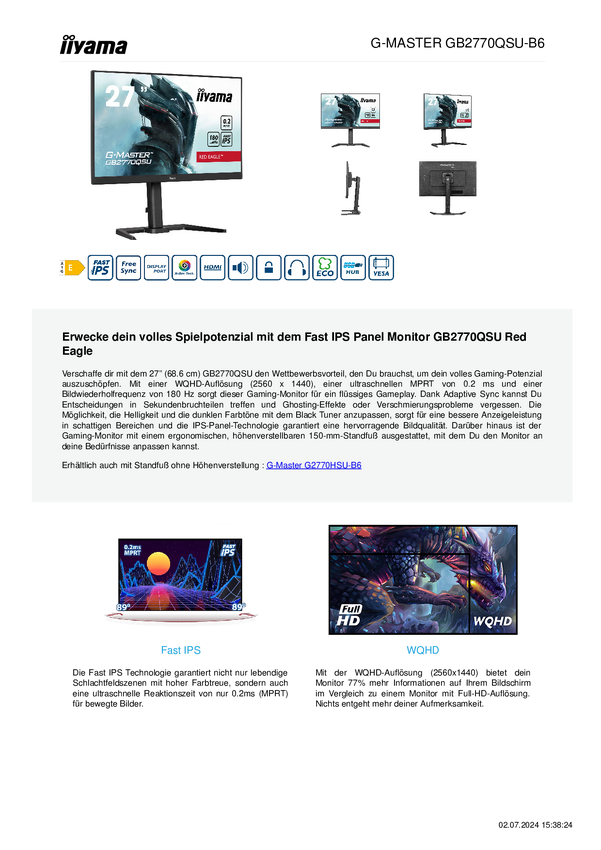 Iiyama G-MASTER Red Eagle GB2770QSU-B6 Monitor EEK E (A - G) 68.6 cm (27 cal) 2560 x 1440 px 16:9 0.2 ms HDMI, DisplayPo