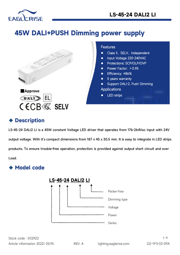 Zasilacz do LED 24V 1,88A 40W z funkcją DALI | LS-45-24DALI2