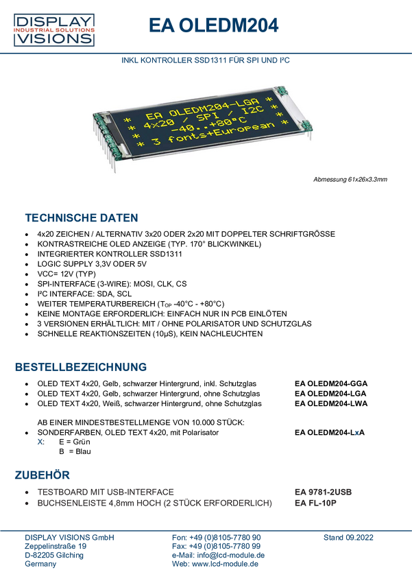 Moduł OLED Display Elektronik EAOLEDM204-LGA żółty czarny (S x W x G) 61 x 28 x 2.4 mm
