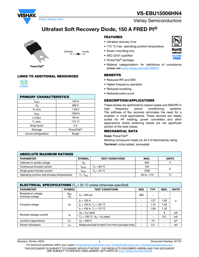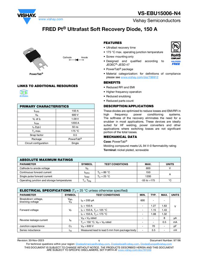 FRED Pt® Ultrafast Soft Recovery Diode, 150 A