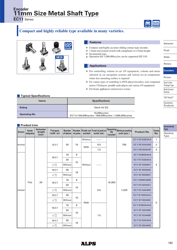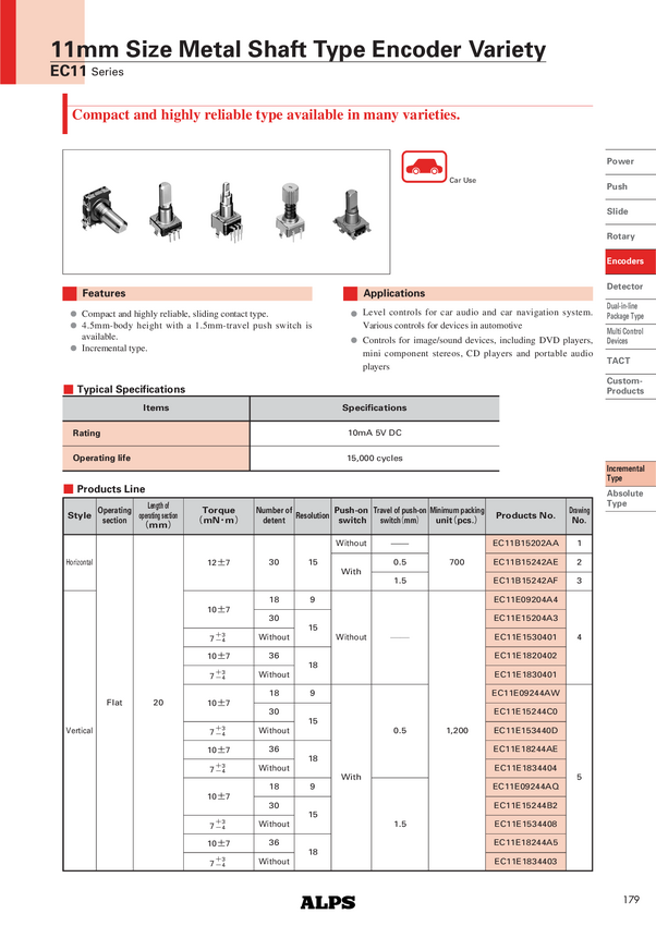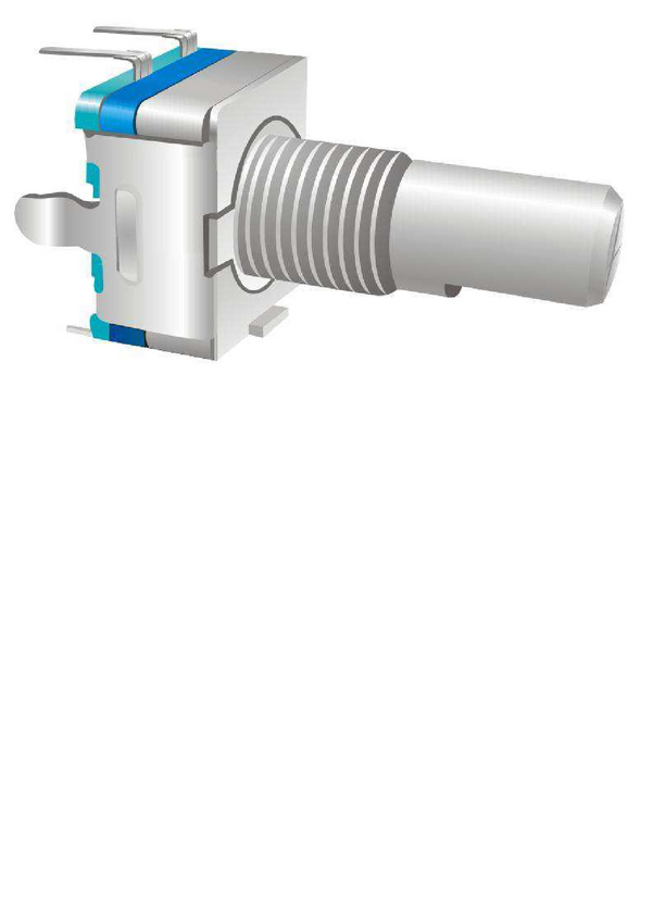 Impulsator EC11- stykowy inkrementalny produkcji firmy Alps; obudowa 11,7mm; ośka 6mm; dł. ośki 20mm; ilość zapadek 30; ilość impulsów 15; dodatkowy przycisk w ośce"push-on switch" 1,5mm ; trwałość 15.000 cykli; przewlekany stojący; rys. 5