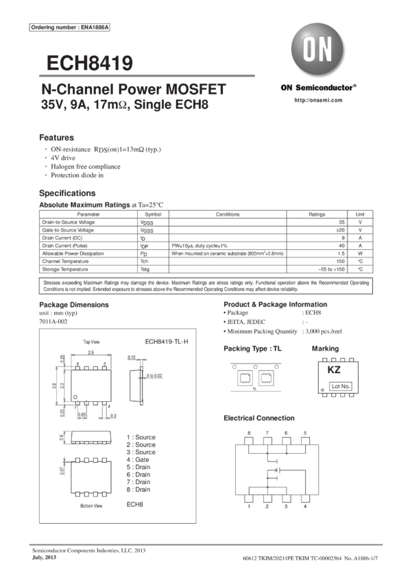 Power MOSFET 35V 9A 17 mOhm Single N-Channel ECH8