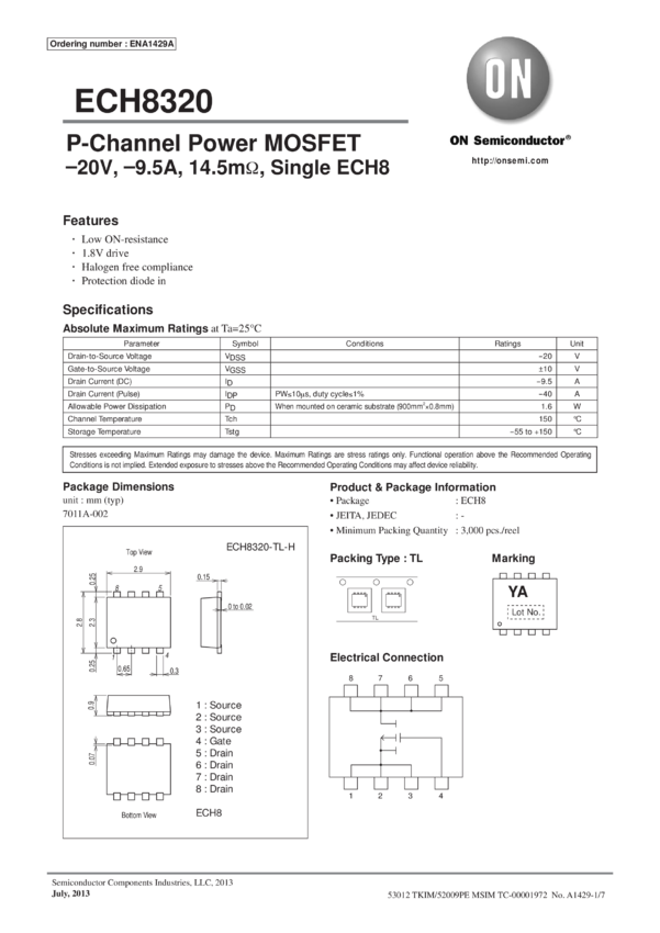Power MOSFET -20V -9.5A 14.5 mOhm Single P-Channel ECH8