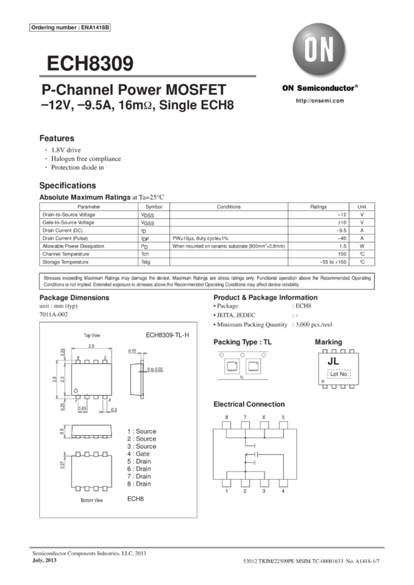 Power MOSFET -12V -9.5A 16 mOhm Single P-Channel ECH8