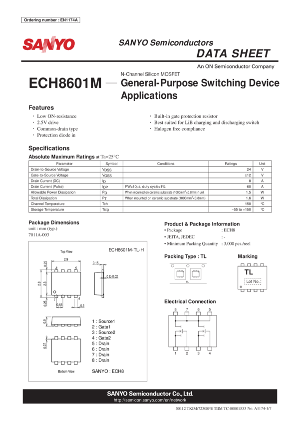 Power MOSFET 24V 8A 23 mOhm Dual N-Channel ECH8
