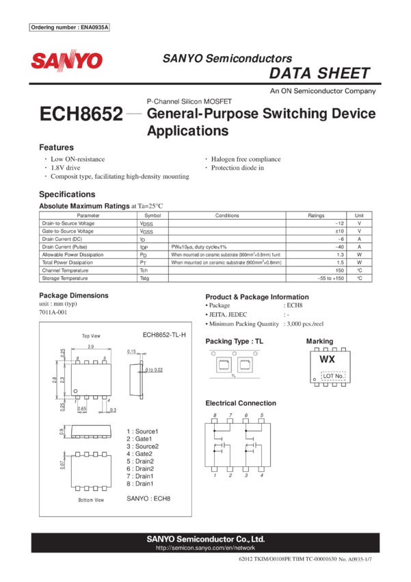 Power MOSFET -12V -5A 37 mOhm Dual P-Channel ECH8