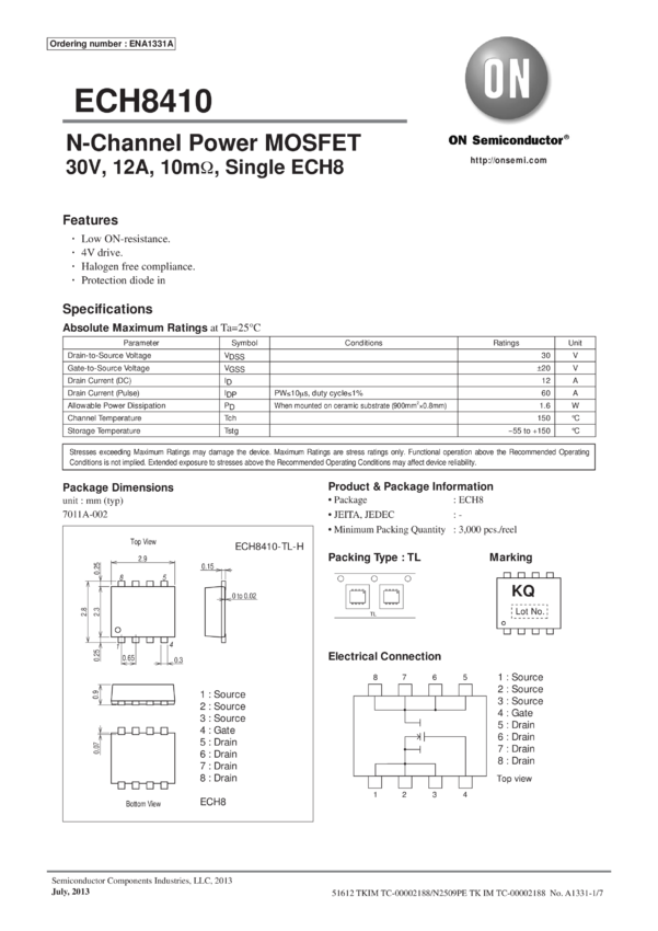 Power MOSFET 30V 12A 10 mOhm Single N-Channel ECH8