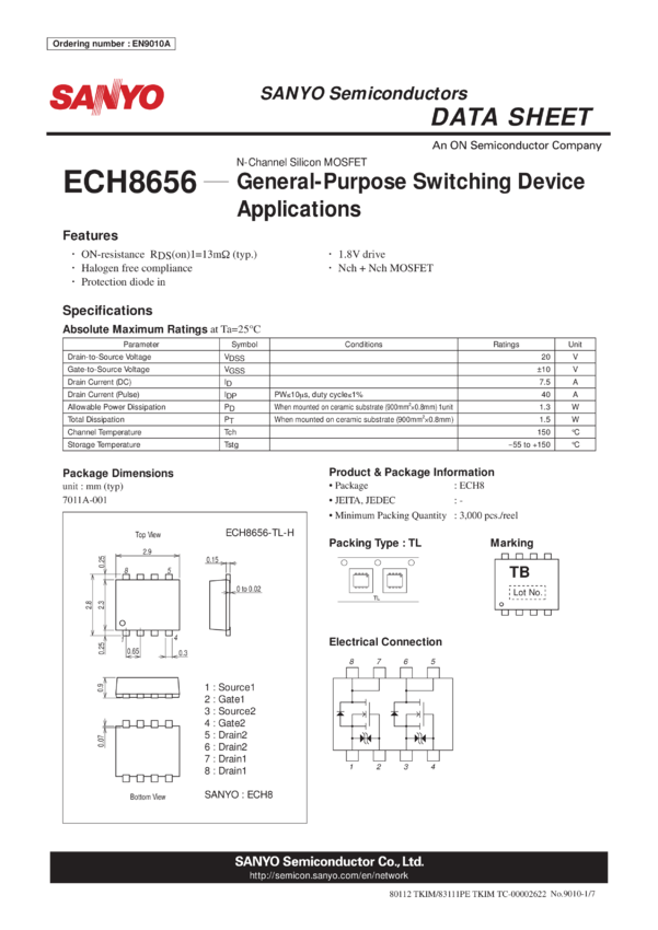 IGBT 400V 150A VCE(sat);5.6V max. N-Channel Single ECH8